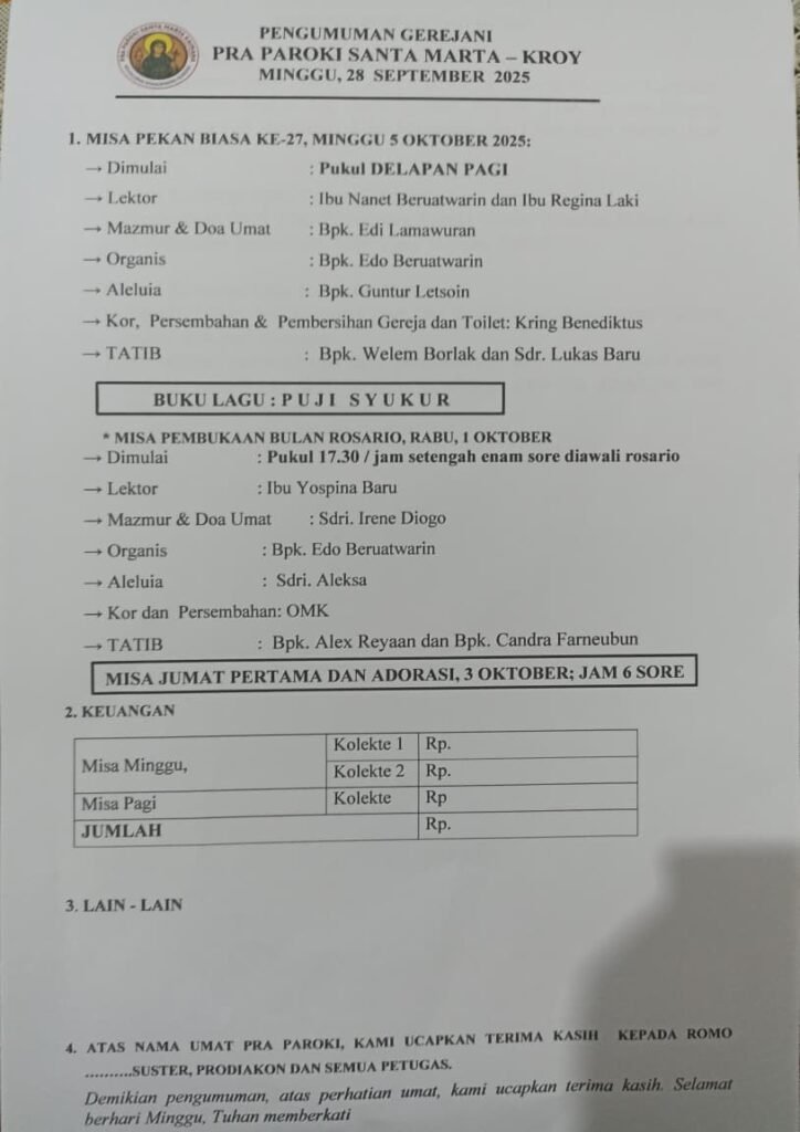 Pengumuman Gerejani Pra Paroki Santa Marta, Minggu 28 September 2025